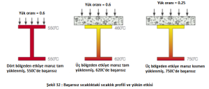 Yangın limitinde taşınan yük, BS5950 Bölüm 8’de verilen yük faktörleri kullanarak hesaplanmaktadır. Eğim yapan tam olarak yüklenmiş bir kiriş normal olarak yaklaşık 0.50 – 0.60 aralığında bir yük oranına sahiptir. Araştırma bilgilerinden bilinen 0.25 yük oranı ile, örneğin kompozit olmayan beton döşeme taşıyan kirişte çökme 750ºC’ye kadar oluşmayacaktır. Tam olarak yüklenmiş durumda sınır sıcaklığının 130ºC artışı durumu aşağıda verişmiştir: